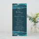 This elegant, modern wedding program features teal blue watercolor agate top and bottom borders trimmed with silver faux glitter. The text appears in elegant silver grey handwriting and copperplate fonts on a deep teal background.