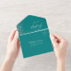 The left-hand edge of this elegant modern all-in-one wedding invitation and RSVP features a silver faux glitter border. The customizable text combines silver gray whimsical handwriting, copperplate and italic fonts on a teal blue background. The return address appears on the outside flap and the reverse side of the detachable RSVP card in silver gray text on solid teal. A QR code is included on the RSVP card for guests who would prefer to reply online.