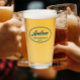 Beer glass for the wedding groomsman that features his name printed in a trendy, teal blue colour, stylised script inside a teal blue colour oval border along with wedding year date. A great party supply idea for a bachelor party! Personalise your beer glass by editing and replacing name and date with your own. Available in many, popular wedding colour schemes.