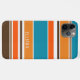 Keep your new electronic device safe from scuffs and scratches with this protective contemporary sunny yellow, orange, teal blue, tan, dark brown, and white coloured striped stripes pattern cell phone case. With room to customise with a name, monogram, or initials of your choice. Beautiful, modern, and cool cover for the trend-savvy and art-loving hip trendsetter, vintage retro look style motif lover who wants to protect their phone from dust and dirt, wear and tear. This design is available in Apple iPhone 6, 7, and 8 Plus, 10 or X, XR, XS, 11, 12, and 13 Mini, 14, 15 Plus, and Pro Max cellphone cases. Show off your style, look fashionable trendy, and feel stylish with a unique design on a mobile device accessory of your choice.
