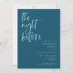 Minimalist wedding rehearsal dinner invitation featuring modern script font that says "the night before." The background colour is teal blue.