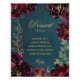 A teal blue jewel tone wedding Desserts Table list print featuring a symphony of deep bordeaux raspberry red peonies adorned with gold spray and shimmering gold outlines gather around a deep teal blue watercolor wash background with your names in gold rustic script and a small uppercase non serif font announcing the details.