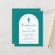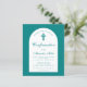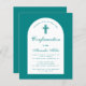 A modern confirmation invitation for a boy. On teal blue background, it has a white arch with teal text inside. The occasion and the name are written in an elegant calligraphic script; the first line is arched text.