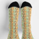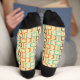 These socks have teal blue, chocolate brown and orange colour scheme to coordinate with your outfit. A simple pattern of rectangles and lines that's got a groovy seventies sort of feel. This pattern has a cream coloured background with the geometric design in teal blue or aqua blue, orange and chocolate brown. The geometric graphics have a scratchy distressed look for a worn vintage feel. The vintage-inspired colours are perfect for adding a bit of a 1970s feel to your day.