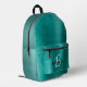 This personalised backpack features a monogram and first name in modern black and white script on an elegant teal blue faux brushed metal background.