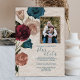 Raised rose gold leaf texture over bold teal, burgundy, dusty pink roses. Handmade crumpled paper in the background with a glitter photo frame are beautiful finishing touches to this vintage wedding invitation. Versatile for teal, gold, burgundy wedding colours.