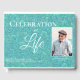 This beautiful Celebration of Life Guest Book features a teal or turquoise cover with the look of embossed leather. The text is in coordinating script and serif fonts in a font faintly teal-almost-white hue. The photo of your loved one will be framed in the same pale colour as the text. One narrow frame encloses the photo; a narrower frame is decorative just inside the outer frame. Remember to substitute your loved one's name on the spine. Our condolences on your loss.