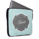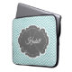 Protect your laptop with a Teal Chevron Personalized Laptop Sleeve. Laptop sleeve design features a teal chevron background and ornate gray tag to personalize with your name and monogram. Additional items available with this design as well. Please contact me directly for assistance with personalization.