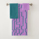 This towel set has a purple washcloth, a teal hand towel and a bath towel with an art deco design that looks like likes on a circuit board. The lines are running vertically in teal on a field of purple. Want a different colour? Message me.