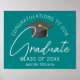 This modern teal custom graduation party poster features your high school or college graduate for the class of 2025. Customise with your graduating year under the chic handwritten script and grey grad cap for trendy personalised graduation party decor.