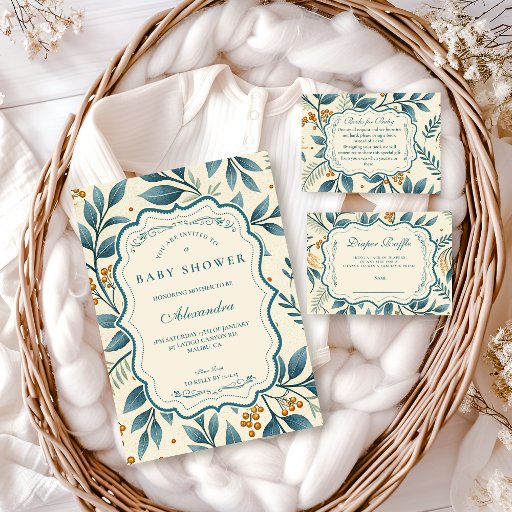 This charming gingham floral design blends soft cottage textures with warm vintage tones, creating a beautifully inviting baby shower aesthetic. Peach blossoms and teal leaves surround an ornate frame, giving the layout a handcrafted and timeless feel. The creamy background and delicate floral details add a touch of warmth, perfect for celebrating a mother-to-be in style. Customize the event details to create a keepsake that feels both personal and elegant.