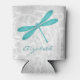 Keep your beverages cold in the summertime with a Teal Dragonfly Personalised Can Cooler. Cooler design features a colourful dragonfly, a soft white leafy vine against a light grey grunge damask background with an area to personalise with your name. Additional gift items available with this design as well as a variety of colours.