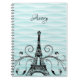 Jot down important notes or reminders with a Teal Eiffel Tower Flourish Notebook. Notebook design features the Eiffel Tower adorned with elegant flourishes against a teal wavy background. Additional colours available with this design as well. This item may be personalised with a name or monogram of your choosing. Please contact me if you need assistance with personalisation.