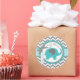 Teal elephant with bird perched on shoulder and grey and white chevron print with 3D-look ribbon trim boy baby shower gift label.