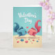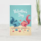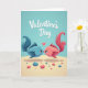 This card shows two stylized fish in teal-blue and coral-pink floating nose-to-nose as if leaning in for a kiss, with a tiny red heart glowing between them 🥰. The background fades through soft teal tones like calm underwater light, giving the scene a gentle, dreamy depth. Each fish has patterned scale textures and big, expressive eyes that linger on the other with sweet attention ❤️. Their fins and tails sweep outward in smooth curves, especially the pink fish’s tail that arcs like a ribbon in the water. Along the bottom, a sandy seabed appears with rounded pebbles scattered in matching blues and pinks. At the top center, the words “Valentine’s Day” sit like a header in a flowing cursive style, colored in a darker teal that stands out against the lighter water. Soft highlights and faint shadows add dimension around the fish bodies and the small heart. The composition is framed by open water around the pair, with the heart placed precisely in the narrow space between their noses.
