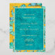 Wedding Invitation with Textured floral pattern teal coloured flowers with golden streaks and rust and gold leaf yellow gold foil textured paper and bright teal blue textured backgrounds. Beautiful artistic floral Wedding Invitation. Vintage watercolor Wedding Invitation. Bright Teal and Flowers on Yellow Gold Collection.