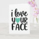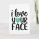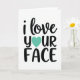 This greeting card keeps things simple with the message “i love your FACE” centered on a plain white background. The words “i love” appear at the top in black, written in a smooth script style that feels personal and warm. Below that, “your” is in black too, and the “o” is replaced by a teal heart that stands out right away ❤️. The last line reads “FACE” in large, rounded, black capital letters that look like a neat sans‑serif font. The mix of script and block lettering gives the message a sweet contrast, like a quick note that still feels thoughtful 💌. With just black text and that single teal heart, the design feels direct, affectionate, and easy to read. It’s a fun way to tell someone you adore them just as they are, maybe with a little chocolate on the side