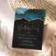 The top border of this trendy birthday invitation features a watercolor image of an agate geode in shades of teal and turquoise with faux gold highlights. Below, on a black background, the words "Birthday Party" appear in faux gold glitter in decorative modern handwriting font. Customise it with the name of the honoree in gold art deco font and the party details in white sans serif type. The same teal agate image appears on the reverse side.
