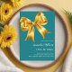 A modern teal coloured background, decorated with a large golden bow. Personalise and add a name and party details.