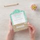 An all in one wedding invitation details with attached perforated RSVP cards.