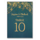 Elegant teal with glittering gold string lights and bokeh wedding reception table number. Contact us for help with customisation or matching products.