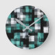 Teal Green Blue Black White Abstract Plaid Round Clock