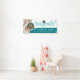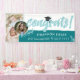Photo graduation banner in white, teal, and turquoise with overlapping photos and greenery with a combination of clean fonts and a brush script. Congrats! graduation banner personalised with three photos of the graduate, the graduate's name, the year, and school. Teal and white greenery graduation party banner with photos and a unique layout.