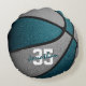 This cool basketball pillow for boys or girls features the realistic image of a basketball that has alternating teal and grey recolored panels - personalise with player name in an "autograph" style font overlying the athlete's jersey number - by katz_d_zynes