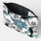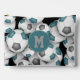 This soccer themed zipper pouch features a random pattern of varied size teal, grey and white soccer balls turned every which way on a black background - customise with the soccer player's monogram - by katz_d_zynes