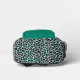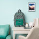 This personalised backpack features a pattern of teal blue and black leopard spots on a white background. Add a monogram and first name in modern black and white script to the teal pocket, with the full name below in white sans serif font. Ideal for back to school!
