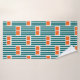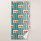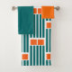 This towel set has an orange washcloth, a teal hand towel, and a bath towel with a mid-century modern design made of five teal lines and two orange rectangles repeated across the design.