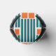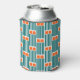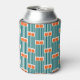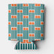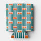 This can cooler has a mid-century modern design made of five teal lines and two orange rectangles repeated across the design.