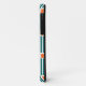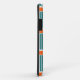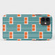 This phone case has a mid-century modern design made of five teal lines and two orange rectangles repeated across the design.