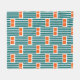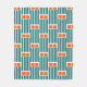 This medium fleece blanket has a mid-century modern design made of five teal lines and two orange rectangles repeated across the design.