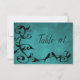 Number your reception tables with a Teal Lovebirds Reception table card. Table card design features a teal grunge background adorned with a leafy vine and two resting lovebirds. Additional wedding stationery available with this design as well.