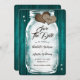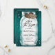 Rustic teal wedding save the date card featuring a mason jar with string lights and burlap hearts against a barn wood background adorned with twinkle lights. Easily personalise this cute rustic teal wedding save the date online. Matching items available to complement this teal wedding save the date.