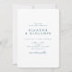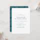 This wedding invitation has a clean white front with the couple's names in spaced teal capitals and all event details in elegant teal type, and a deep teal back covered in a geometric arch and rainbow line pattern in sage green. You customise all names, date, time, and venue.