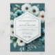 This design features a deep teal backdrop adorned with striking white anemones and cool-toned floral accents. The painterly style creates a moody and sophisticated aesthetic, perfect for a romantic winter event. Delicate green foliage and subtle berries add texture to the lush botanical arrangement. It evokes a sense of ethereal beauty and refined elegance.