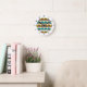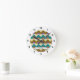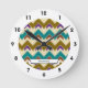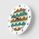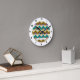This wall clock features a native tribal pattern of chevrons and arrows in teal, brown, red, blue and beige, with feathered edges. Personalise it with a name.