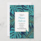 Teal, navy blue and gold tropical leaves wedding bridal shower invitation. This lovely design showcases lovely leaves of Split Leaf Philodendron (Monstera deliciosa) or Swiss Cheese Plant and palm leaves in teal with gold outline on navy blue. Your wording is in a white frame with gold outline. The back is covered with a gold and blue polka dot pattern.