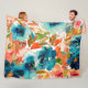 Colourful orange and teal watercolor floral and leaves fleece blanket.
