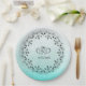 Personalised bride and groom initials and wedding date pretty teal paper plates with fancy decorative black border.