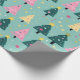 Teal and pink, as well as other fun colours yellow and dark green, highlight jolly little Christmas trees that parade over this roll of light-hearted wrapping paper. This is from a retro watercolor design.