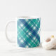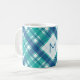 This mug features a trendy teal and dark blue diagonal plaid pattern. A white diamond shape, in the centre, offers a custom monogram.