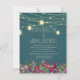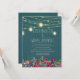 Wedding invitation with a bold teal background and plum purple flowers with twinkling string lights and mason jars.