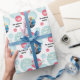 This Christmas gift wrapping features a teal and red Christmas ornament collage with one ornament as a customisable photo frame, and the text: Merry Christmas. Customisable text allows you to add your family name.