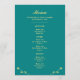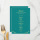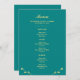 Add an elegant touch to your wedding festivities with this teal and gold wedding menu. The front features the menu items. The back of the menu has the name of the wedding couple and the date of the wedding. Teal Rose design. Use the template to personalise.