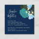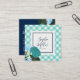 Stylish Floral square business card featuring teal rose, light blue and yellow flowers, and green leaves with an off-white centre and blue borders against a sweet mint turquoise gingham background on the front. On the back: Text in an off-white colour against a blue background with teal rose, light blue and yellow flowers, and green leaves in the right hand corner.