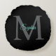 Teal Script Name, Large Grey Monogram on Black Round Cushion