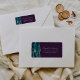 The left-hand edge of this elegant modern wedding return address label features a teal watercolor agate border trimmed with faux silver glitter. The customizable text combines handwriting script and copperplate font in silver gray on a purple background.